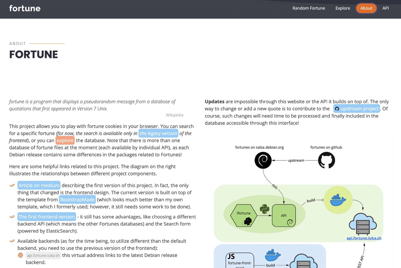 A web page that allows users to play with fortune cookies in the browser. The API is written in Python and utilizes the lfortune library (another one of my projects), which also includes a CLI interface.