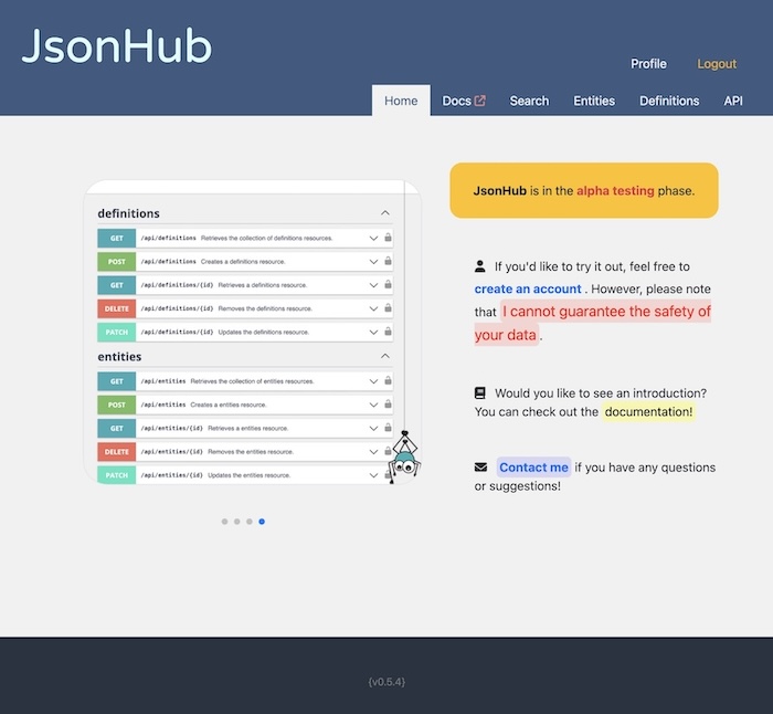 JsonHub is a web application for storing and sharing JSON and JSON Schema documents. It is currently in the early development phase but is already functional.