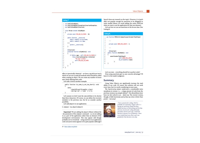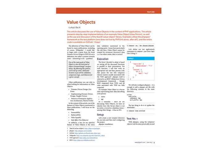 I was excited to receive a message from PHP Architect, one of the most respected PHP magazines in the world, expressing interest in publishing my article. The article, titled "Value Objects," was featured in the June 2023 issue of PHP Architect magazine!