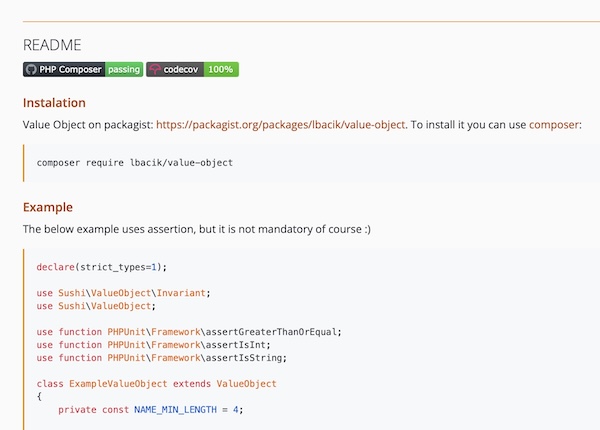 The library contains the unit tests written using the PHPUnit framework, but there have also been phpspec tests created (BDD), which can be found in the value-object-spec repository.